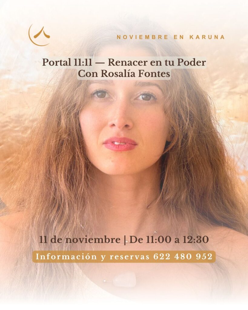 El 11 de noviembre se abre un poderoso portal energético, una puerta a la manifestación y a la conexión con tu yo superior. Únete a Rosalía Fontes en Karuna para una sesión especial diseñada para alinear tu energía con esta vibración mágica y despertar la fuerza que reside en ti. Es el momento de soltar lo viejo y renacer en tu auténtico poder.