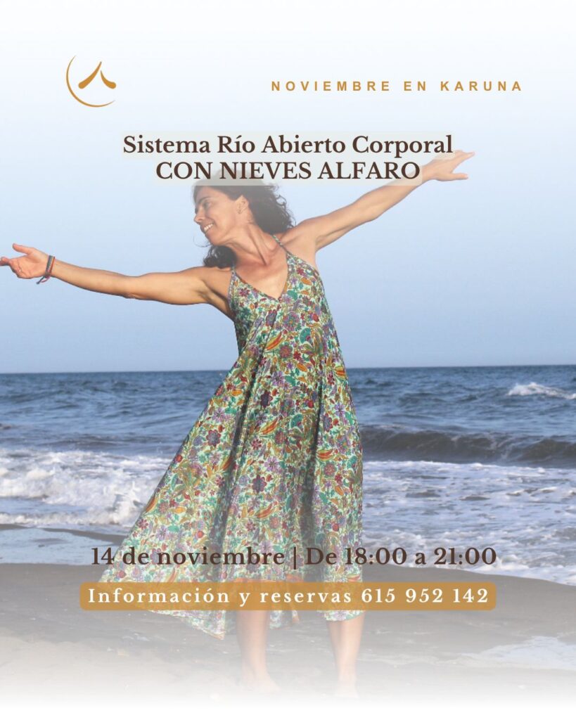 Te invitamos a fluir y a soltar a través del Sistema Río Abierto Corporal, una poderosa herramienta de trabajo psicocorporal guiada por Nieves Alfaro. Una oportunidad para despertar tu vitalidad, reconectar con la alegría y habitar tu cuerpo con plena conciencia y libertad para revitalizar cuerpo, mente y espíritu.