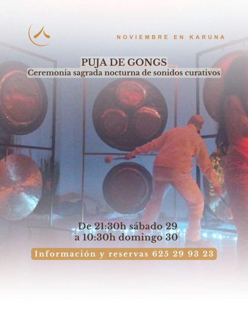 Sumérgete en un océano de vibraciones sanadoras y prepárate para un viaje transformador que durará toda la noche. Te invitamos a la Puja de Gongs en Karuna, una ceremonia sagrada donde el sonido te guiará hacia un estado de relajación profunda, reseteo celular y conexión espiritual.